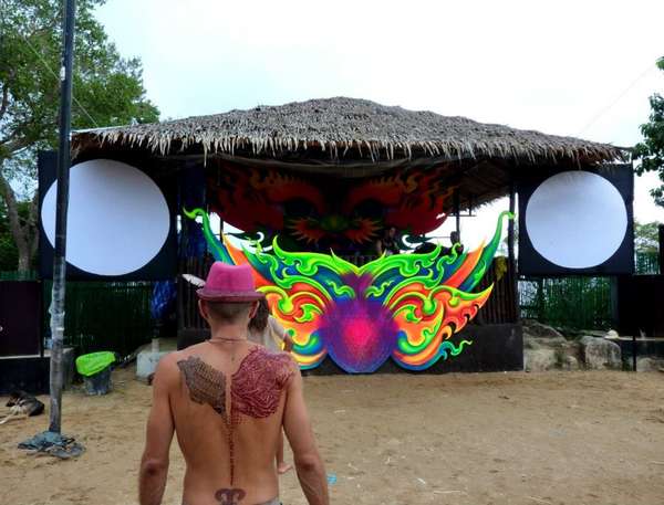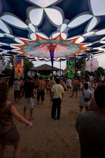 The Experience tries to please all music palates by providing a range of music from pure psychedelic trance to progressive and full-on as well. The festival is located on a hill with spectacular views over golden beaches below. As you enter the festival site, the first thing that strikes you is the beautiful décor filling up the space between the palm trees and fusing its structure into a perfect harmony with nature. Two massive backdrops embellish the DJ box on each side, each featuring a mesmerising dragon that seems to be protecting the dance floor from all the bad spirits. As I found out the two wicked backdrops were made by Carin Dickson from South Africa, who is an internationally known artist that has been providing the décor for such festival as Boom and Ozora.